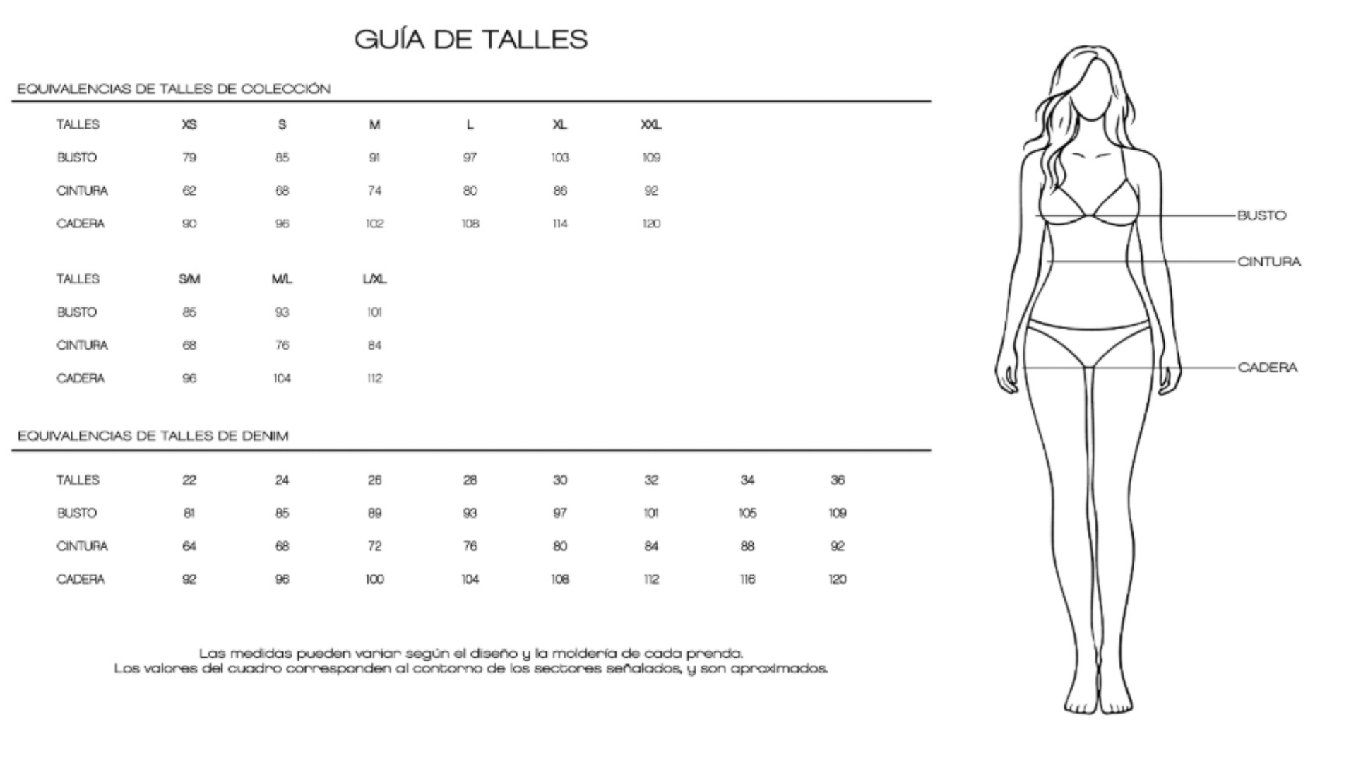 Medidas del talle base: - Largo total: 110 cm - Contorno de cintura: 68 cm - Tiro delantero: 33 cm - Tiro trasero: 41 cm La progresión entre talles es de 4 cm de ancho y 1 cm de largo.
